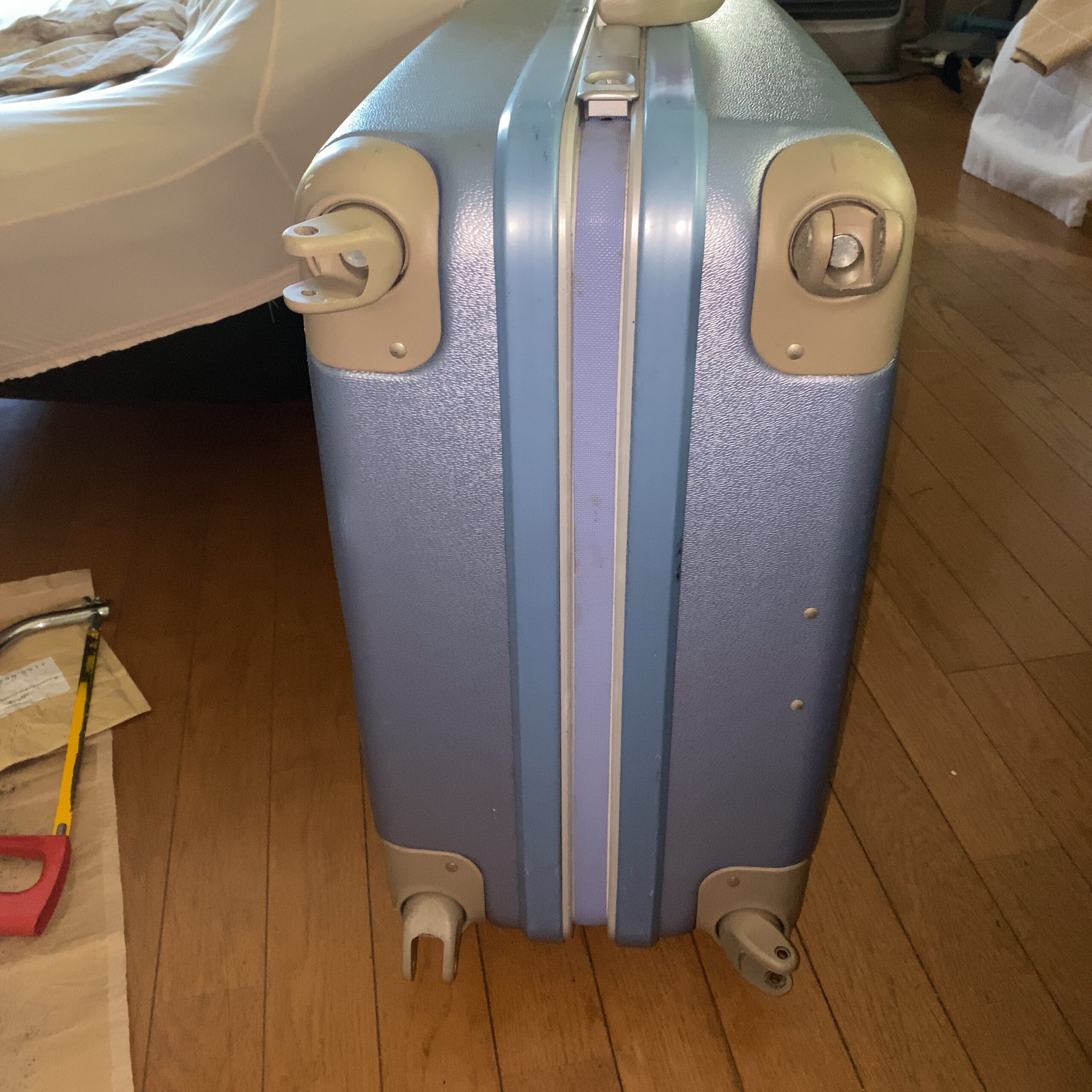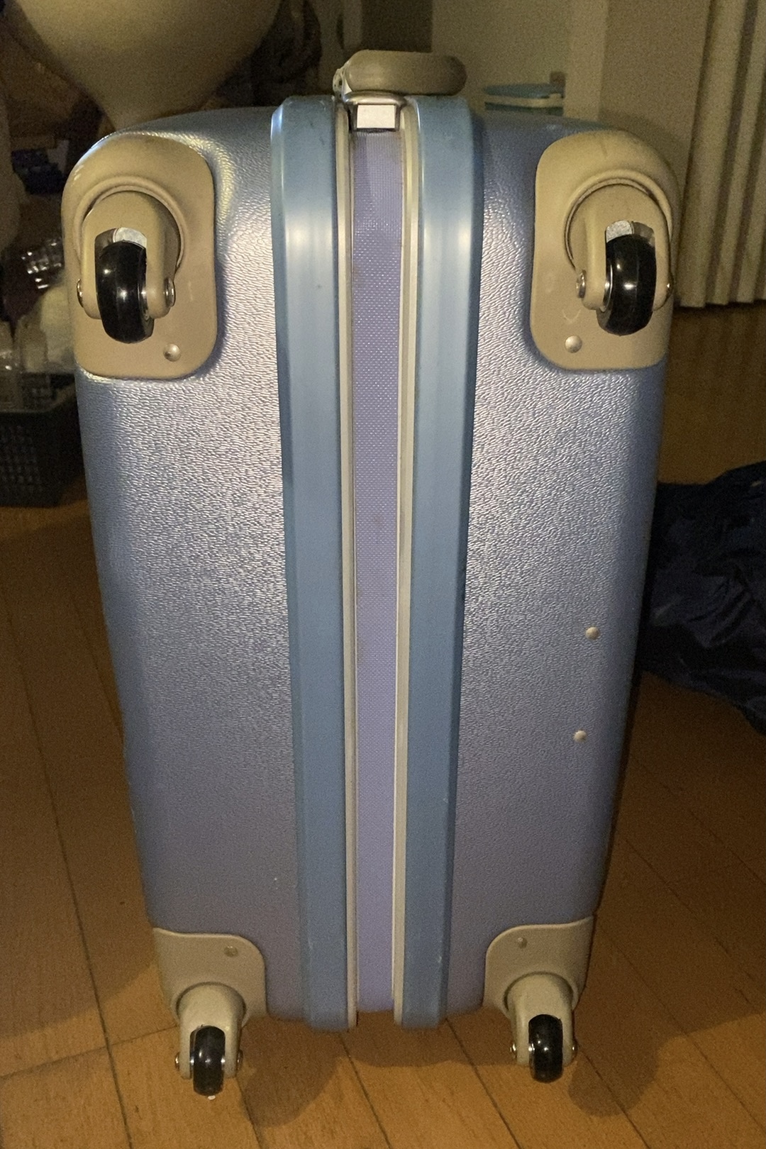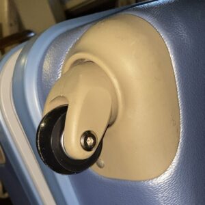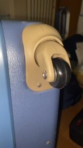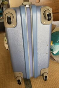 スーツケースは、古くなるとキャスターに付いてる車輪のタイヤ(ゴム製?)だけが木っ端みじんになって、プラスチック製のホイールだけが綺麗に残されてしまいます。