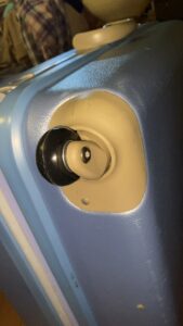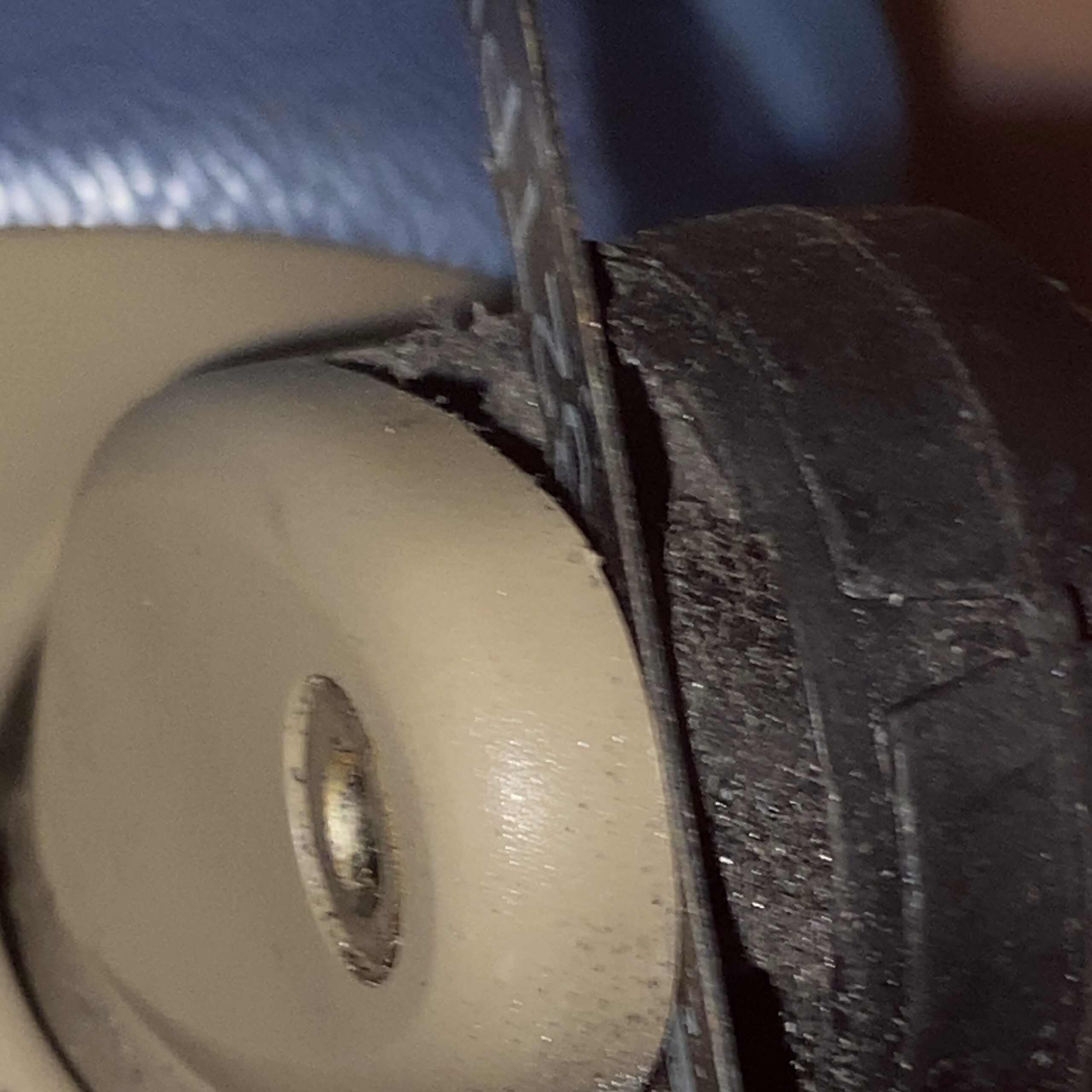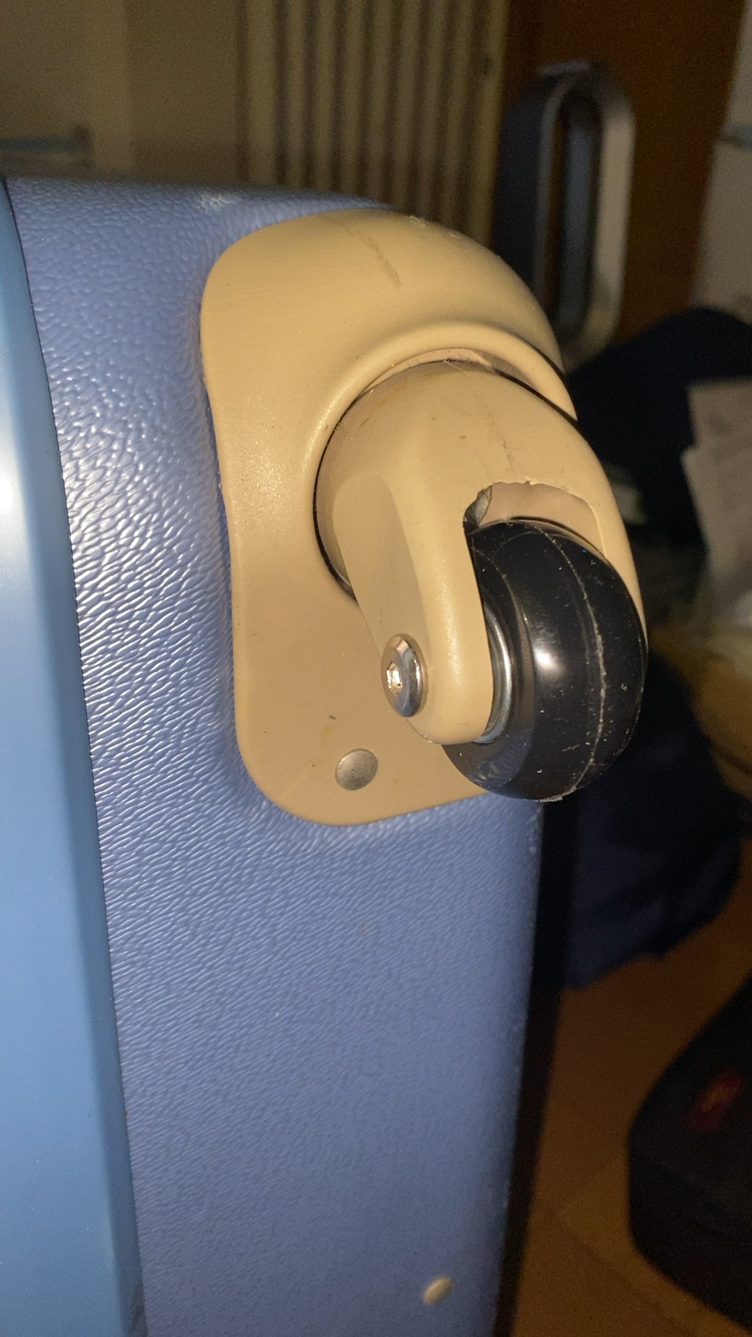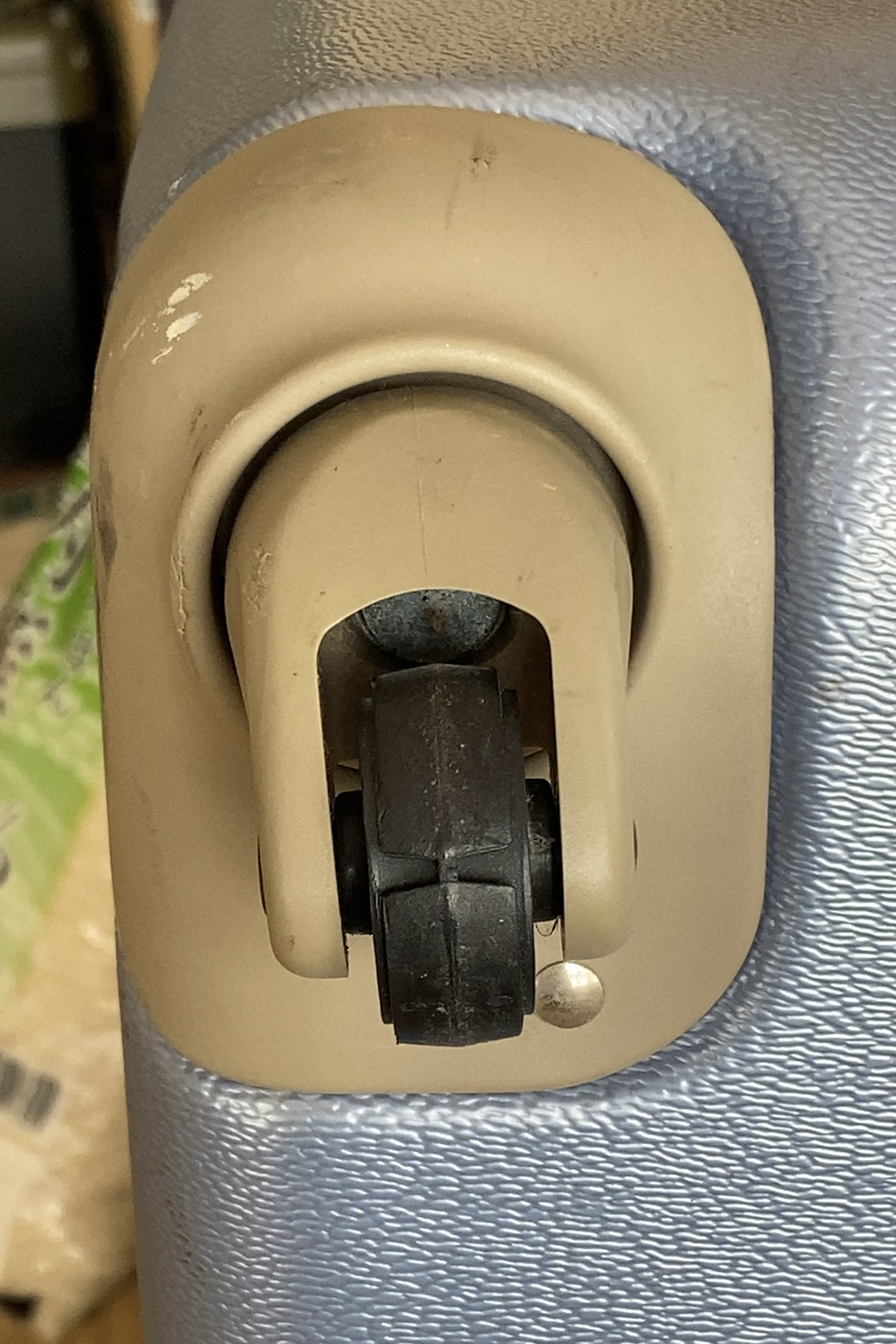 スーツケースは、古くなるとキャスターに付いてる車輪のタイヤ(ゴム製?)だけが木っ端みじんになって、プラスチック製のホイールだけが綺麗に残されてしまいます。