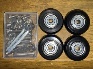 寸法間違いにならないよう、慎重に車輪の直径はプラホイールの直径から推測して、4~4.5cmをチョイス、車輪の幅、車軸の長さなどの寸法から検討をつけた商品を注文し無事に修理は完了しました。