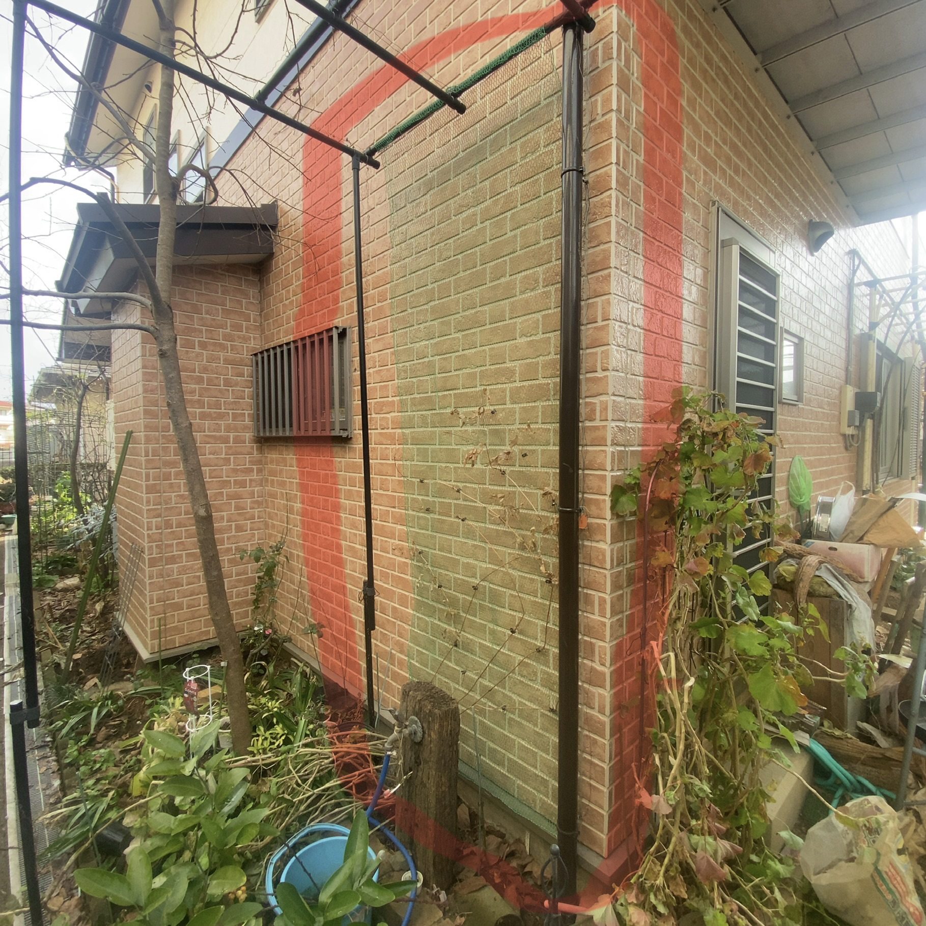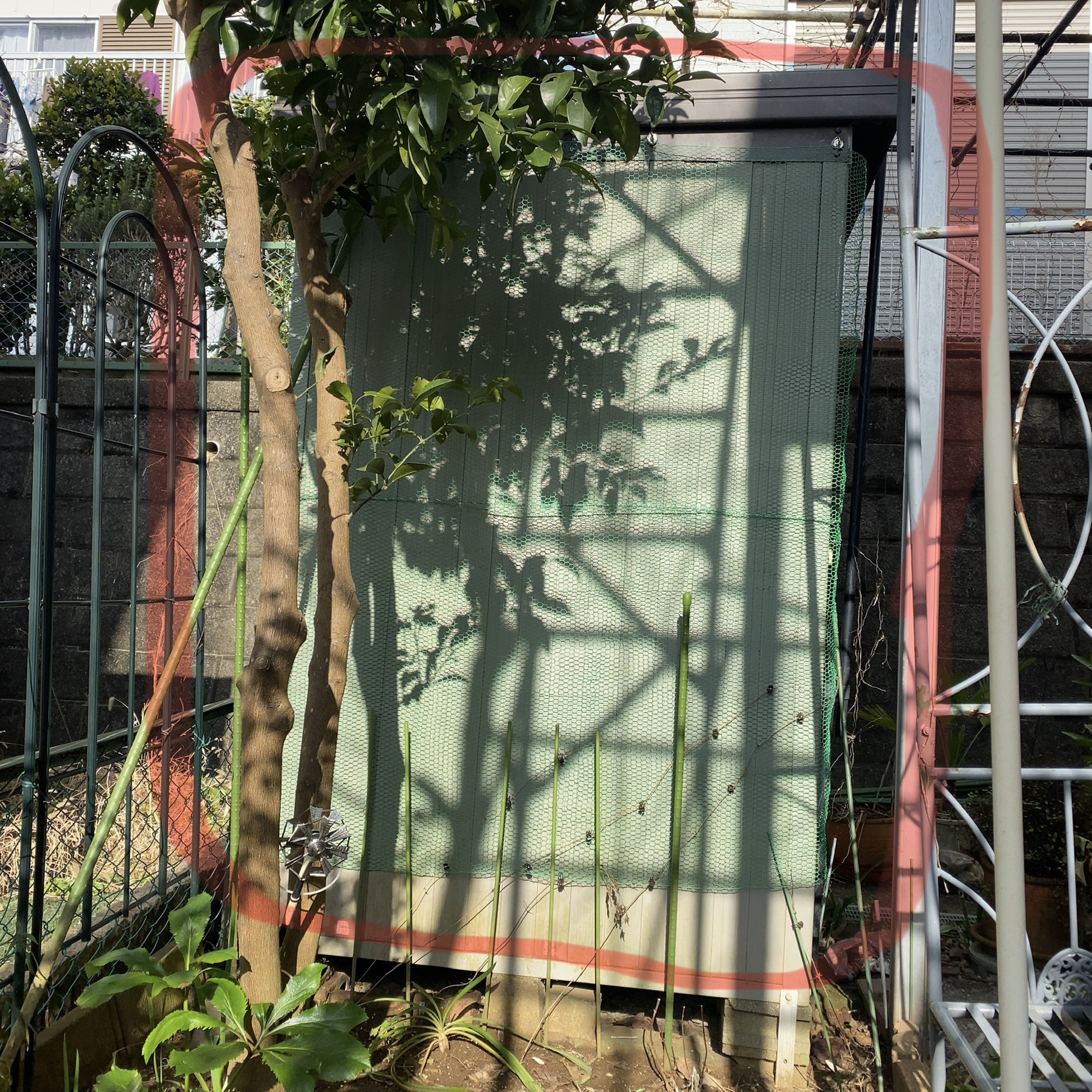 1.庭にある物置の左側壁にグリーン金網貼り付け