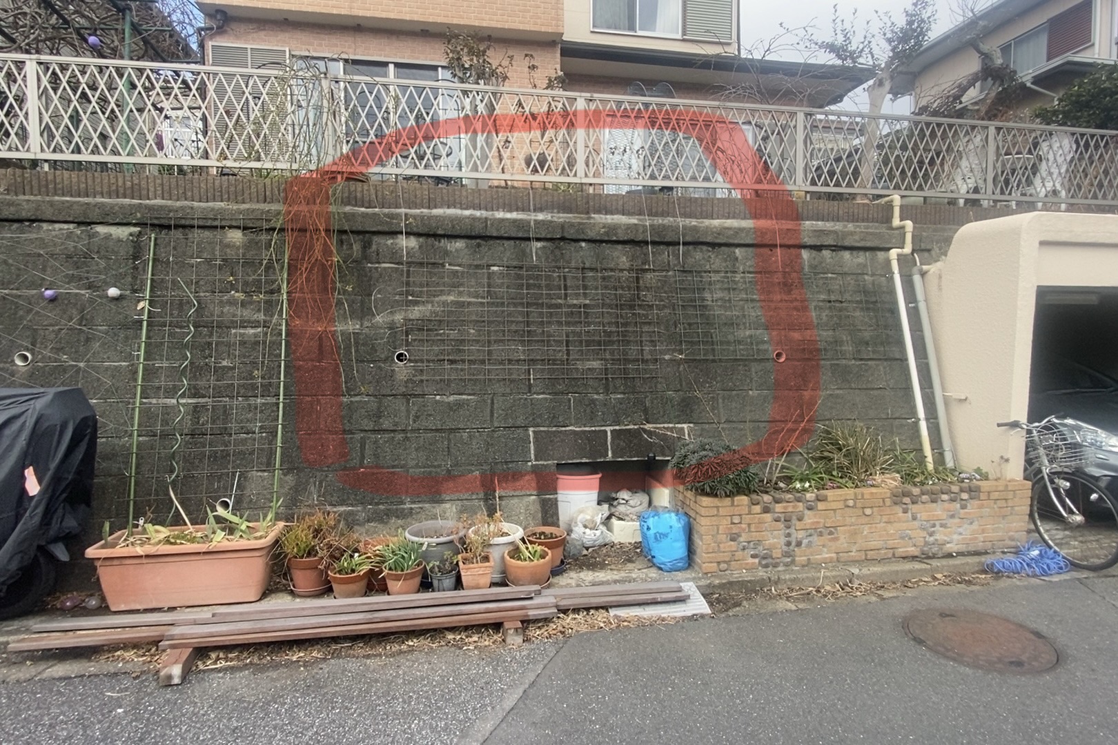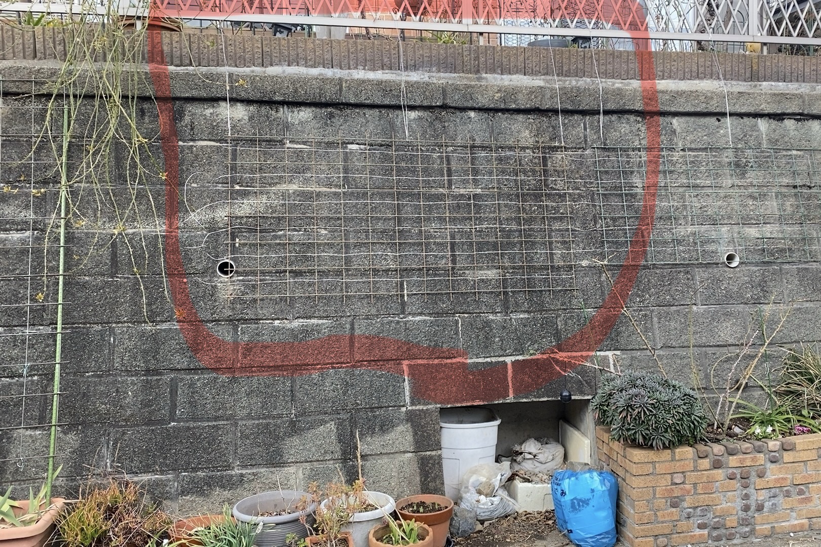 3.庭下の間知(けんち)ブロック壁に鉄網ぶら下げ