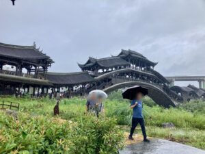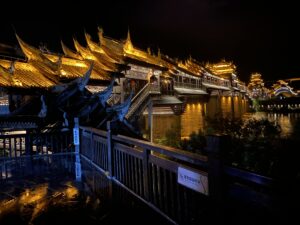 写真の場所は、中国の重慶市 黔江区(けんこうく)にある「濯水古鎮(たくすいこちん)」の「濯水風雨廊橋(たくすいふううろうきょう)」ですね!