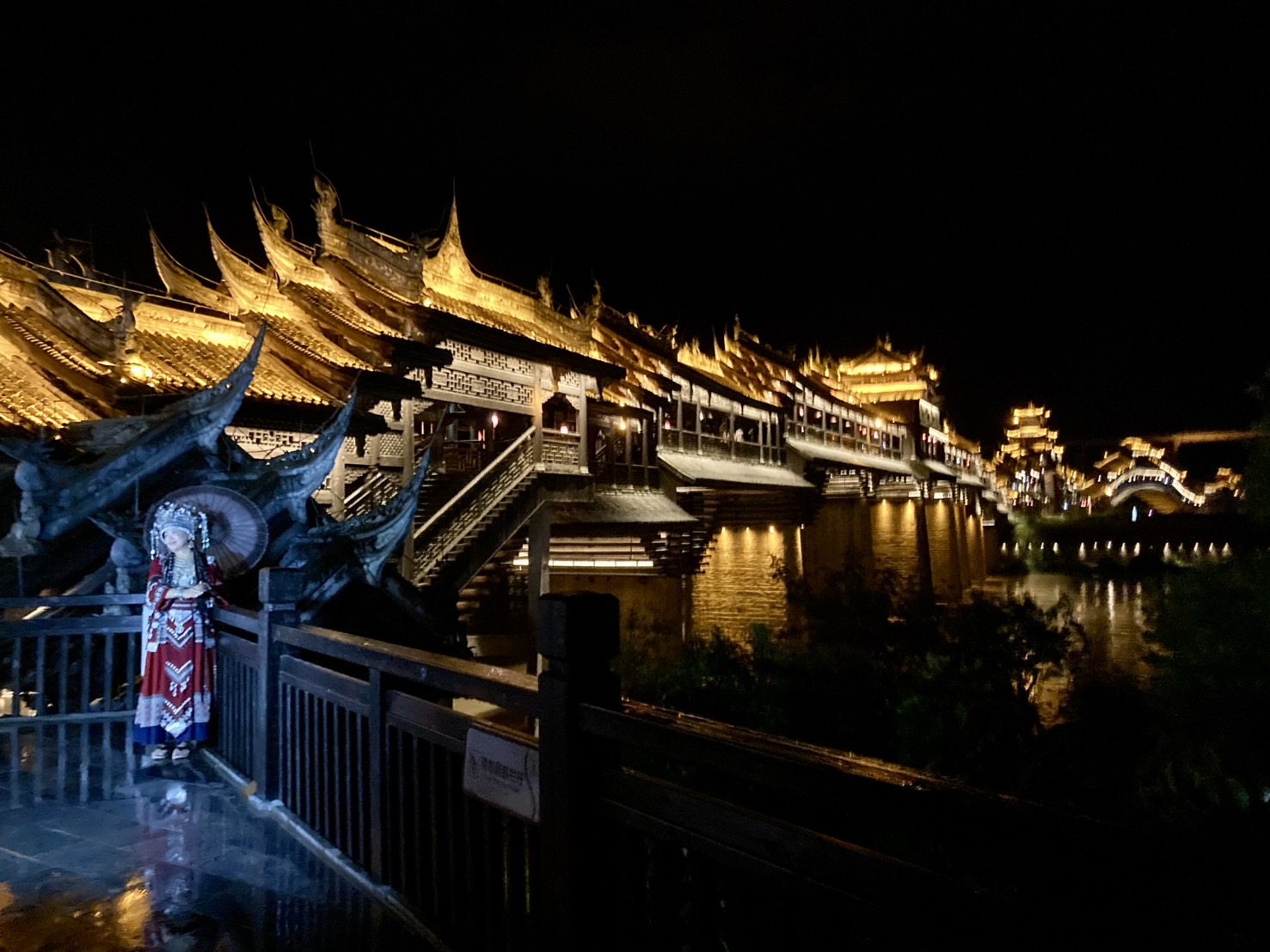 - 夜景と民族衣装: 写真2の美しいライトアップはもちろん、手前に写っている女性の華やかな銀細工の頭飾りは、この地域一帯(武陵山地周辺)に多く住む**ミャオ族(苗族)やトゥチャ族(土家族)**の伝統的な装飾です。
