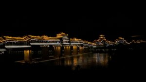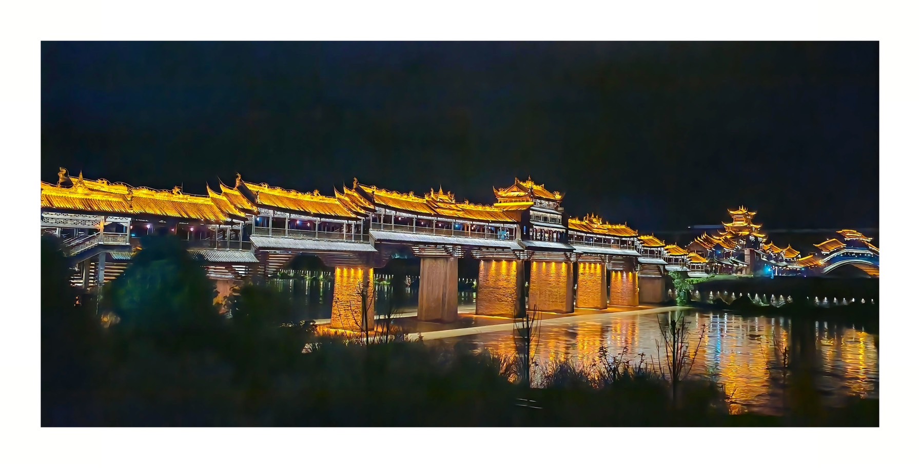 - 独特な形状の長い橋: アーチ型の橋桁の上に美しい波打つ屋根が乗り、さらに多層の楼閣が連なるこの壮大な木造風の橋は、阿蓬江(あほうこう)にかかる濯水風雨廊橋の最大の特徴です。全長658メートルにも及び、「世界一の風雨廊橋」とも称されています。