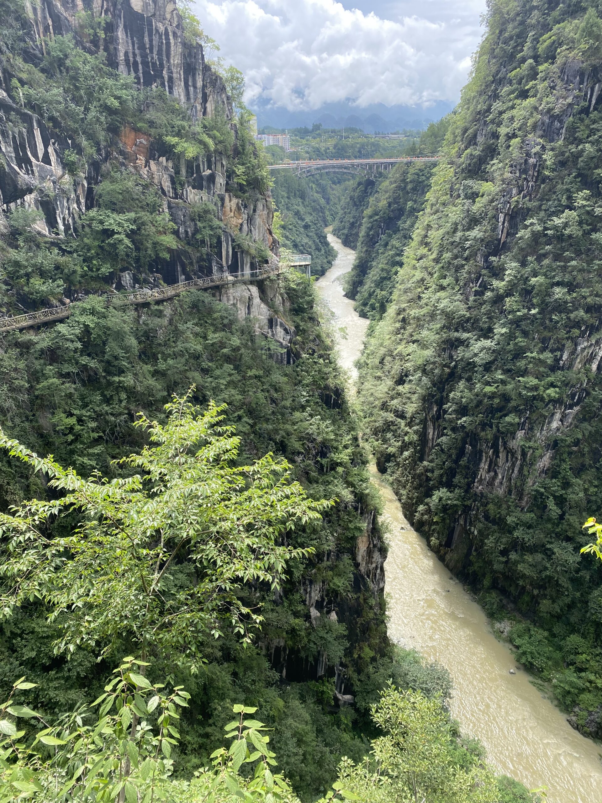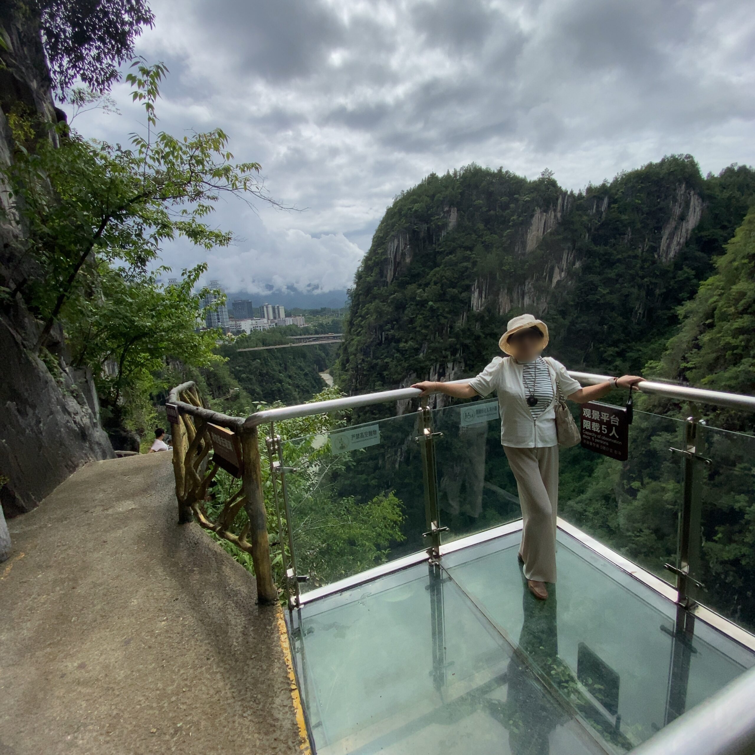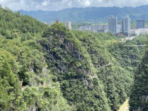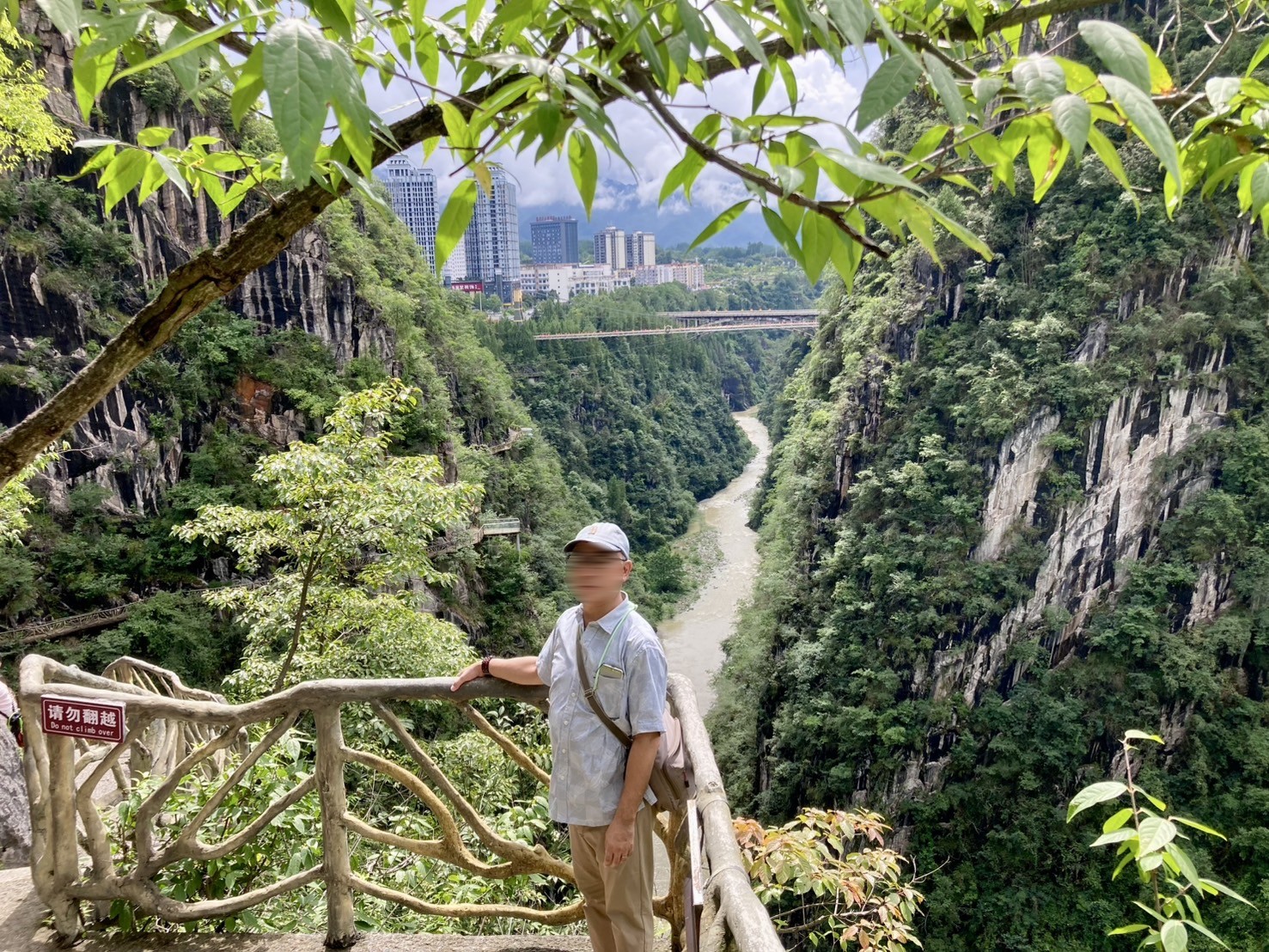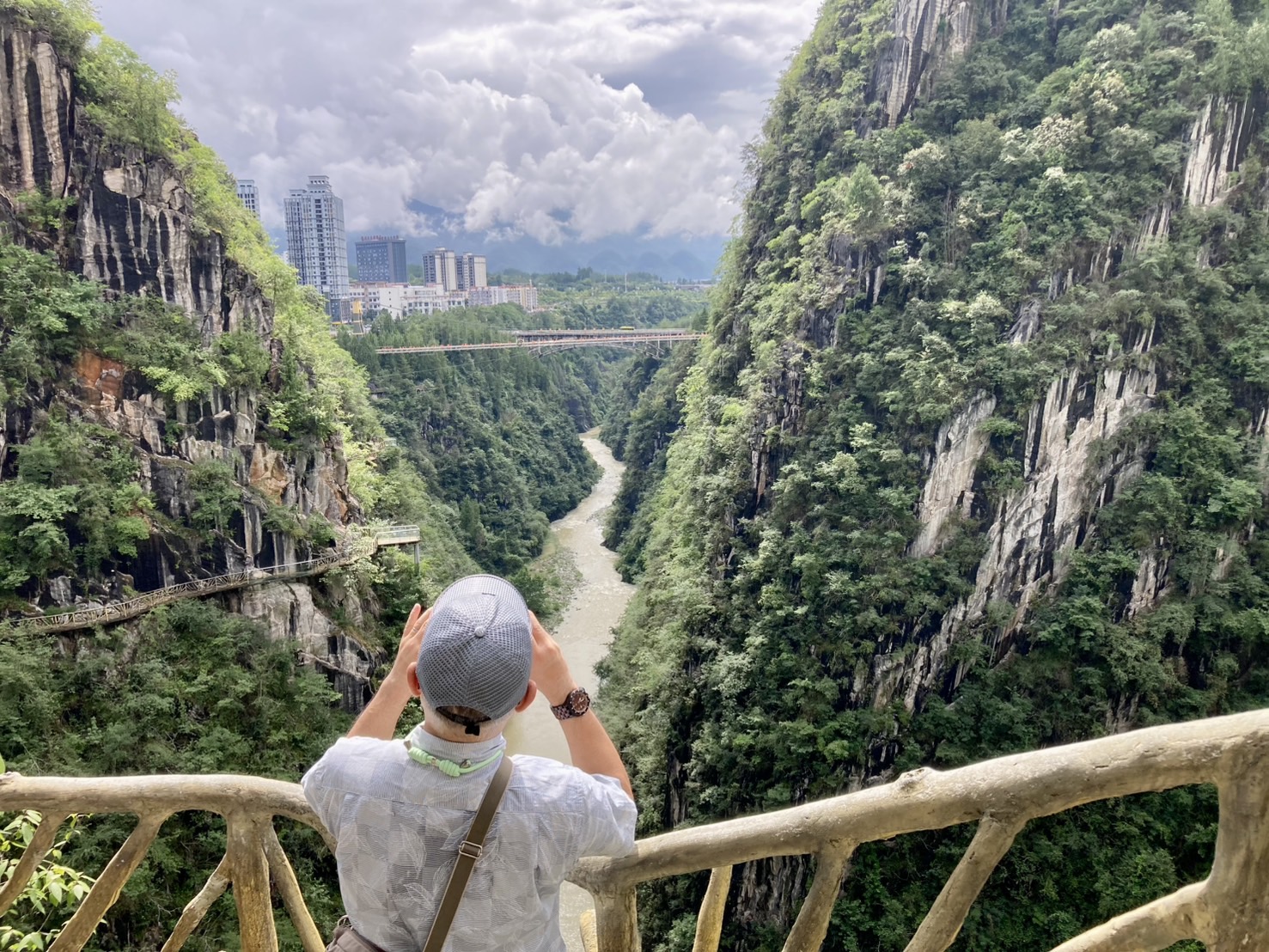 現在、黔江城市大峡谷(芭拉胡)の観光ルートは、お写真にもあった「空中桟道(崖沿いの遊歩道)」やガラスの展望台など、基本的に**「上から見下ろしてスリルと絶景を味わう」**ように作られています。最大落差500メートルにもなる垂直に近い絶壁のため、観光客が歩いてそのまま谷底の川辺まで降りられるような道やエレベーターは整備されていません。