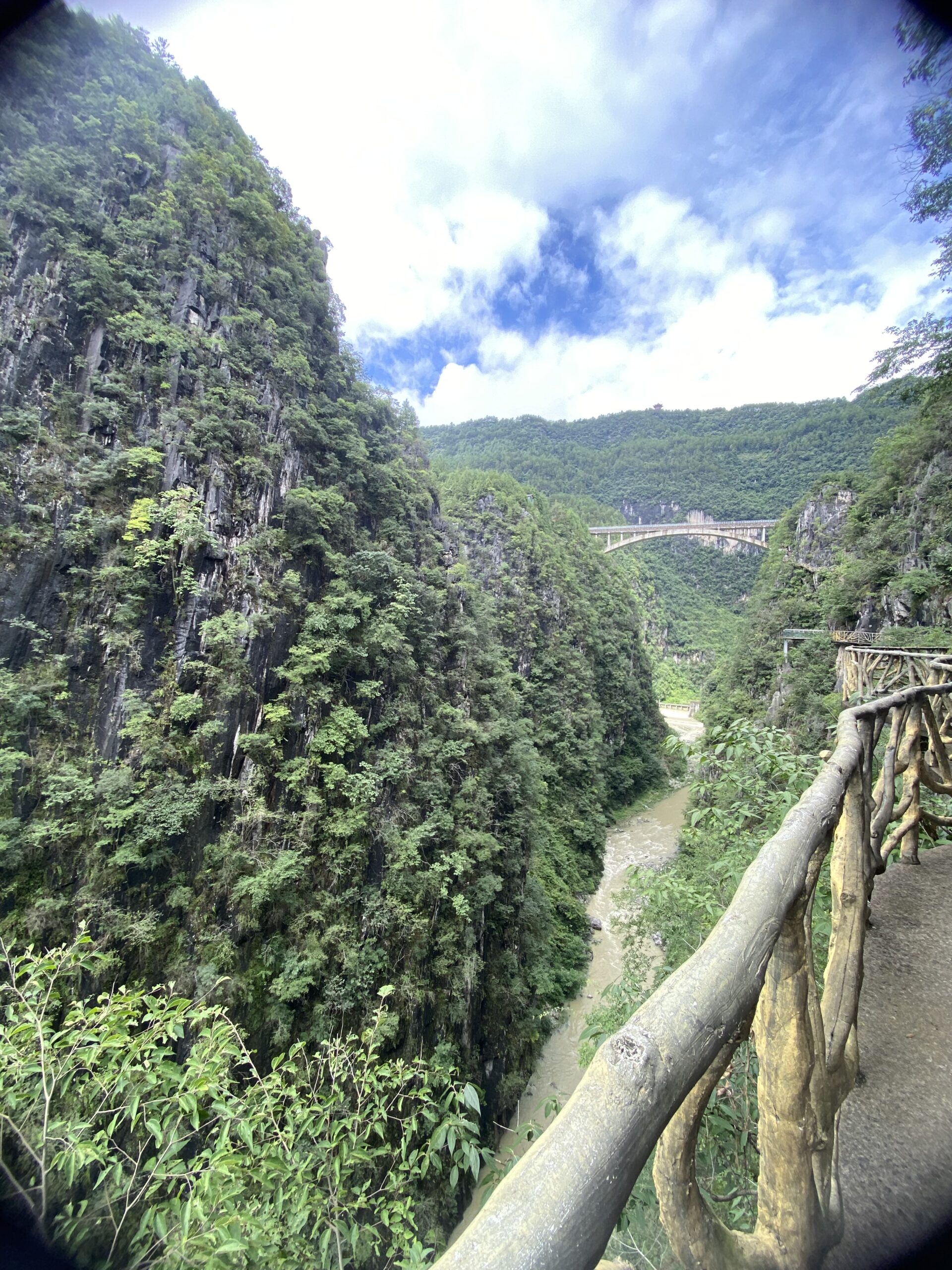 谷底を流れているのは「阿蓬江(あほうこう)」という川です。おっしゃる通り、もしあの場所の川面にたどり着こうと思ったら、峡谷のずっと上流か下流から船に乗って遠くからアクセスするしかありません。ただ、黔江エリアでボート観光のメインとなっているのは、この大峡谷の真下ではなく、先ほど少しご紹介した「蒲花暗河(巨大な地下の川)」や、同じ阿蓬江にある「神亀峡」という別の渓谷エリアになります。