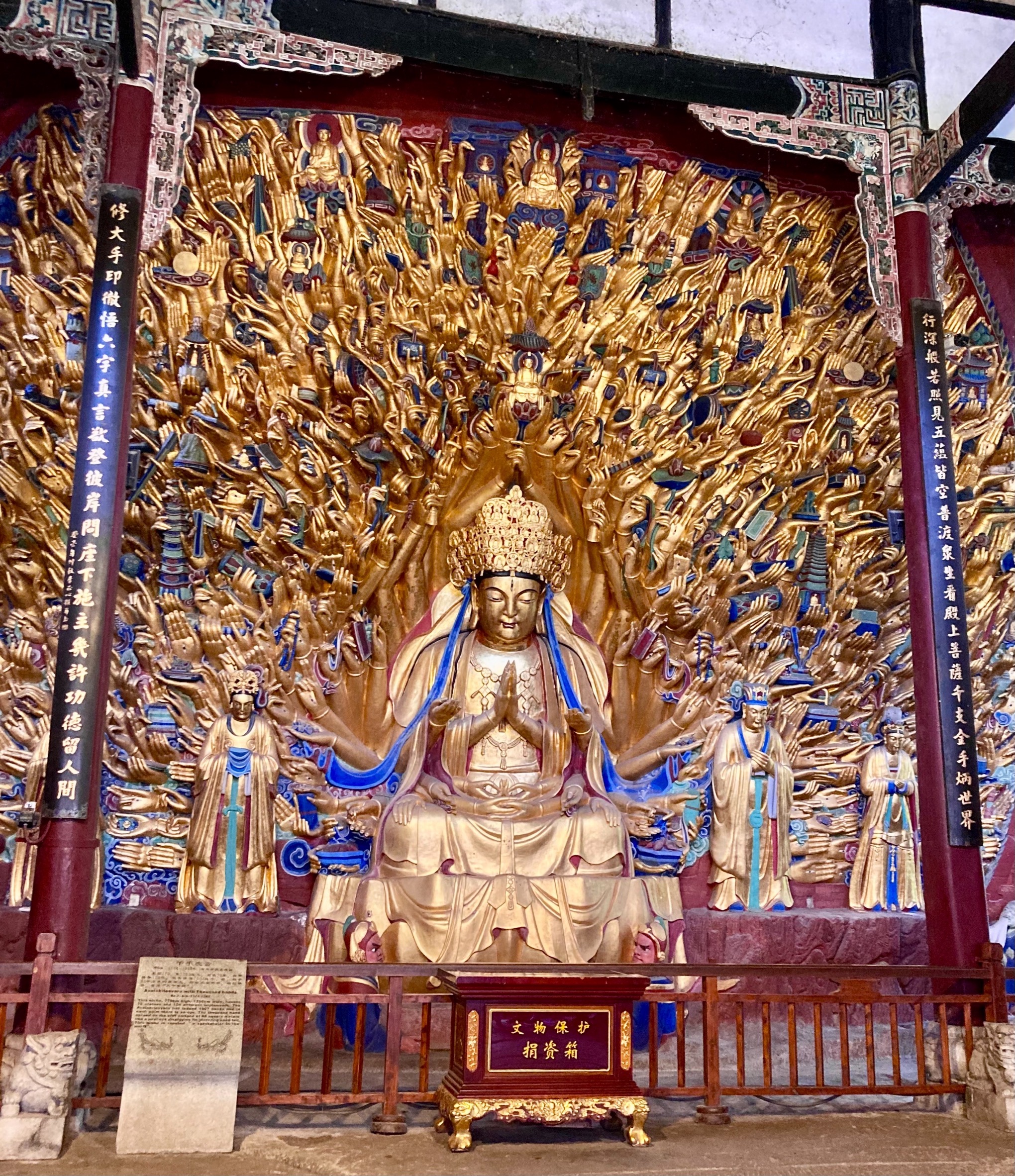 お写真のまばゆい**「千手観音像」**は、8年がかりで最先端の科学技術と伝統工芸を駆使して修復されたものです。100万枚以上の金箔が貼り直され、南宋時代に作られた当時の圧倒的な輝きを見事に現代に蘇らせました。
