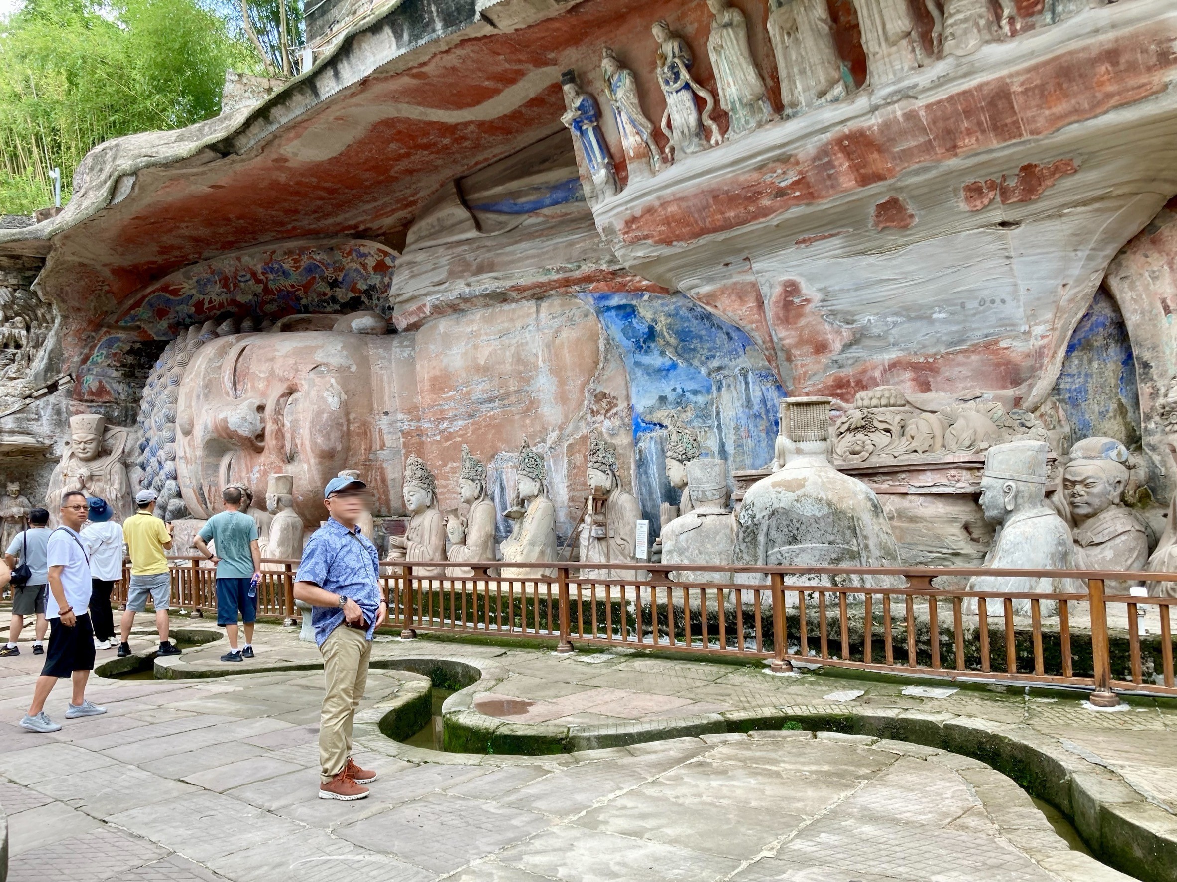 - 巨大な釈迦涅槃像 (IMG_8249.jpg): 岩壁をダイナミックに利用して彫られた、巨大なお釈迦様が横たわる姿(涅槃像)です。全身ではなく上半身だけが彫られ、下半身は岩の中に隠れているという独特の構図が宝頂山ならではの特徴です。